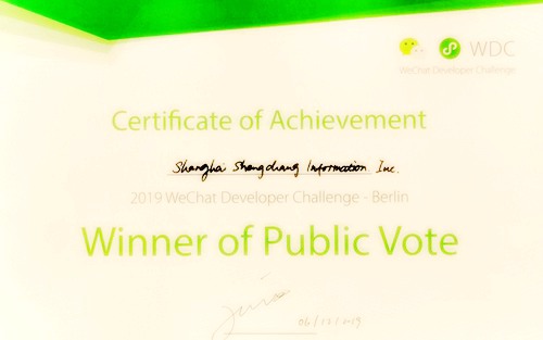 升畅信息在柏林举办的全球性技术大会TechCrunch,2019 微信开发者挑战赛上赢得最受欢迎奖